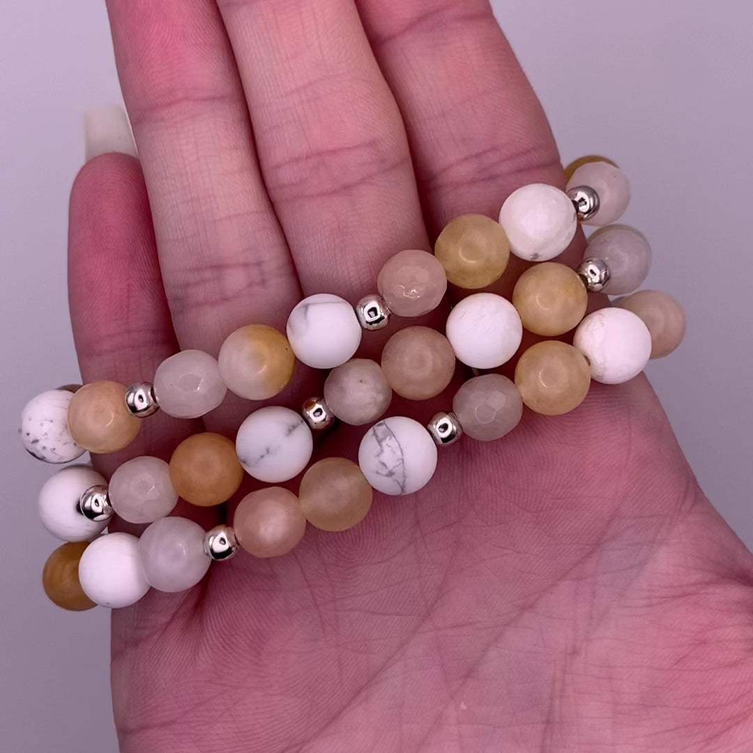 8mm Yellow Aventurine, Howlite and Quartz Bead Bracelet